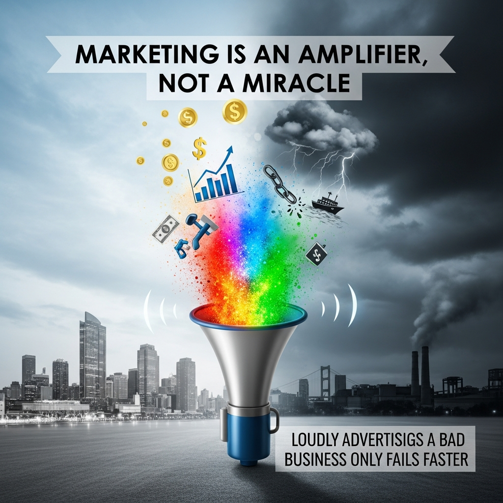 Marketing doesn’t create miracles. When you think about marketing as an amplifier, it becomes clear why businesses with poor foundations crash faster when marketed aggressively. **It’s akin to turning up the volume on a broken stereo system**; the louder you make it, the more apparent the distortions become.